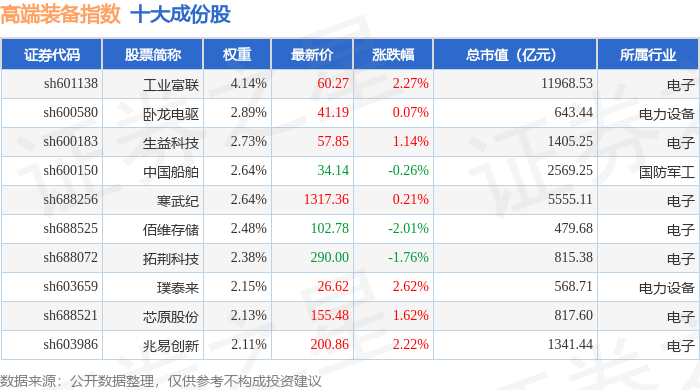 高端装备(000097)指数十大成份股详情如下:
