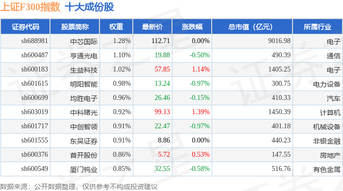 上证F300(000099)指数十大成份股详情如下:
