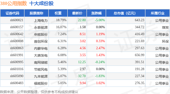 证券之星消息,11月27日,380公用(000113)指数报收于3004.79点,跌0.51%,成交53.03亿元,换手率1.15%。当日该指数成份股中,上涨的有7家,内蒙华电以2.47%的涨幅领涨,下跌的有5家,上海电力以5.0%的跌幅领跌。