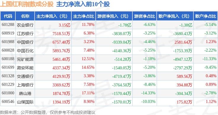 资金流向方面,上国红利(000151)指数成份股当日主力资金净流入合计2.36亿元,游资资金净流出合计2.31亿元,散户资金净流出合计428.28万元。成份股资金流向详情见下表: