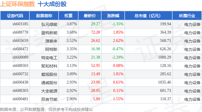 证券之星消息,11月27日,上证环保(000158)指数报收于1302.8点,涨0.4%,成交245.23亿元,换手率0.73%。当日该指数成份股中,上涨的有23家,天奈科技以3.45%的涨幅领涨,下跌的有14家,特变电工以2.29%的跌幅领跌。