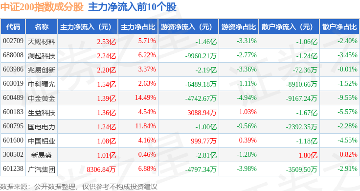 资金流向方面,中证200(000904)指数成份股当日主力资金净流出合计50.87亿元,游资资金净流入合计2.12亿元,散户资金净流入合计48.75亿元。成份股资金流向详情见下表: