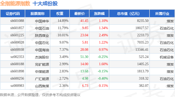 证券之星消息,11月27日,全指能源(000986)指数报收于2308.52点,涨0.83%,成交110.3亿元,换手率0.37%。当日该指数成份股中,上涨的有31家,陕西煤业以2.49%的涨幅领涨,下跌的有16家,美锦能源以2.17%的跌幅领跌。