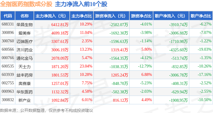 资金流向方面,全指医药(000991)指数成份股当日主力资金净流出合计13.97亿元,游资资金净流入合计6.17亿元,散户资金净流入合计7.8亿元。成份股资金流向详情见下表: