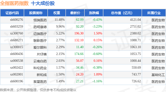 证券之星消息,11月27日,全指医药(000991)指数报收于9049.25点,跌0.5%,成交284.37亿元,换手率0.71%。当日该指数成份股中,上涨的有33家,荣昌生物以4.07%的涨幅领涨,下跌的有73家,三生国健以5.4%的跌幅领跌。