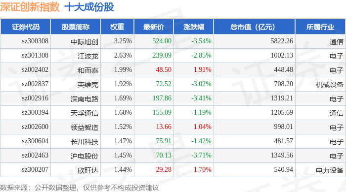 证券之星消息,11月27日,深证创新(399016)指数报收于5391.0点,跌0.44%,成交1472.77亿元,换手率2.1%。当日该指数成份股中,上涨的有37家,广和通以7.09%的涨幅领涨,下跌的有62家,沪电股份以3.71%的跌幅领跌。