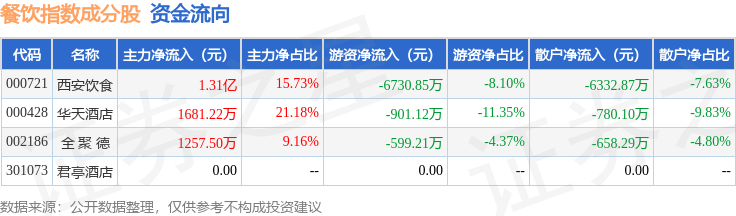 资金流向方面,餐饮指数(399238)成份股当日主力资金净流入合计1.6亿元,游资资金净流出合计8231.18万元,散户资金净流出合计7771.26万元。成份股资金流向详情见下表: