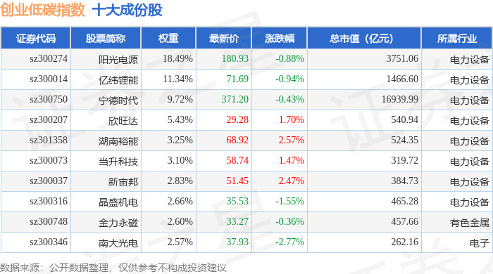 证券之星消息,11月27日,创业低碳(399259)指数报收于4843.84点,涨0.21%,成交539.79亿元,换手率2.88%。当日该指数成份股中,上涨的有29家,鹏辉能源以14.64%的涨幅领涨,下跌的有19家,南大光电以2.77%的跌幅领跌。