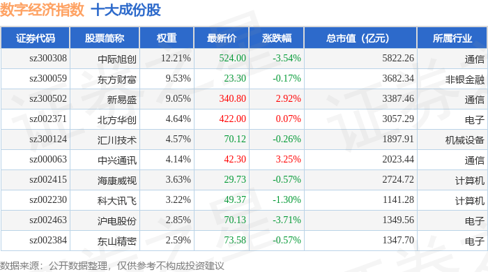 证券之星消息,11月27日,数字经济(399262)指数报收于2653.04点,跌0.7%,成交1329.66亿元,换手率2.04%。当日该指数成份股中,上涨的有11家,中兴通讯以3.25%的涨幅领涨,下跌的有38家,沪电股份以3.71%的跌幅领跌。