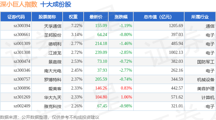 深小巨人(399268)指数十大成份股详情如下: