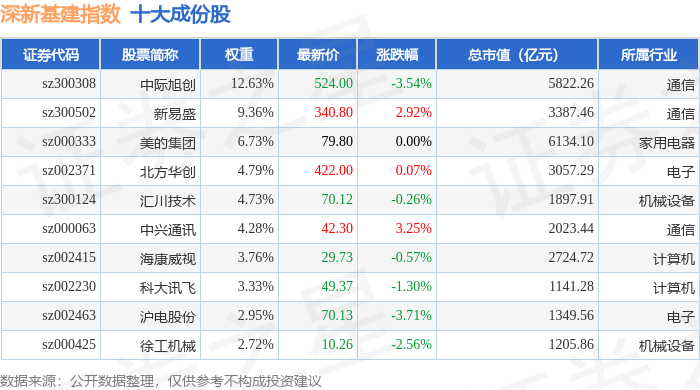 证券之星消息,11月27日,深新基建(399274)指数报收于5597.37点,跌0.75%,成交1223.66亿元,换手率1.8%。当日该指数成份股中,上涨的有9家,中兴通讯以3.25%的涨幅领涨,下跌的有39家,沪电股份以3.71%的跌幅领跌。