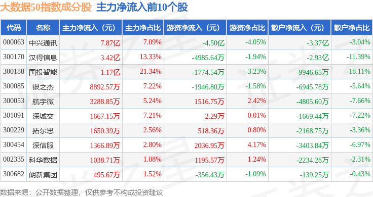 资金流向方面,大数据50(399282)指数成份股当日主力资金净流出合计9.51亿元,游资资金净流入合计6018.55万元,散户资金净流入合计8.91亿元。成份股资金流向详情见下表: