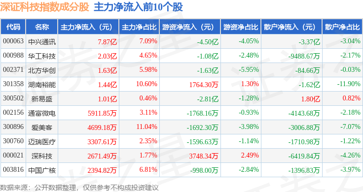 资金流向方面,深证科技(399339)指数成份股当日主力资金净流出合计49.51亿元,游资资金净流入合计5.96亿元,散户资金净流入合计43.54亿元。成份股资金流向详情见下表: