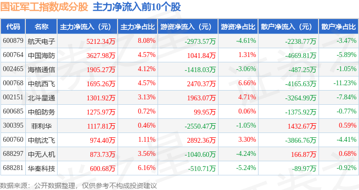 资金流向方面,国证军工(399368)指数成份股当日主力资金净流出合计7.37亿元,游资资金净流入合计1.7亿元,散户资金净流入合计5.67亿元。成份股资金流向详情见下表: