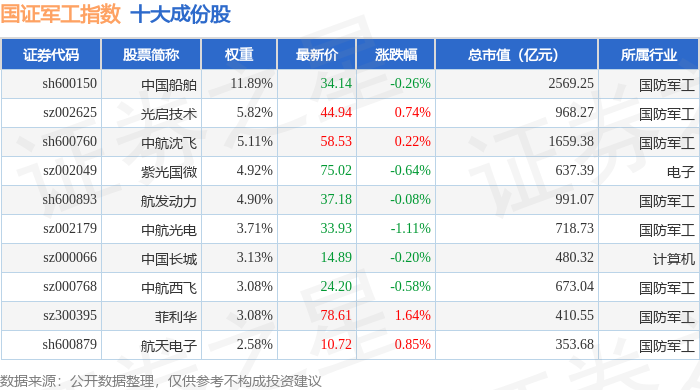 国证军工(399368)指数十大成份股详情如下: