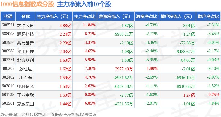 资金流向方面,1000信息(399388)指数成份股当日主力资金净流出合计47.17亿元,游资资金净流入合计2.96亿元,散户资金净流入合计44.21亿元。成份股资金流向详情见下表: