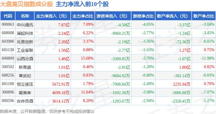 资金流向方面,大盘高贝(399405)指数成份股当日主力资金净流出合计30.4亿元,游资资金净流入合计12.27亿元,散户资金净流入合计18.12亿元。成份股资金流向详情见下表: