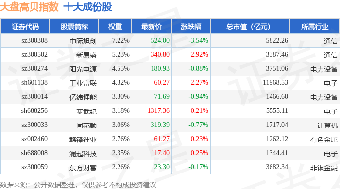 证券之星消息,11月27日,大盘高贝(399405)指数报收于3022.71点,跌0.12%,成交1886.02亿元,换手率1.21%。当日该指数成份股中,上涨的有21家,恒立液压以10.0%的涨幅领涨,下跌的有26家,万科A以7.13%的跌幅领跌。
