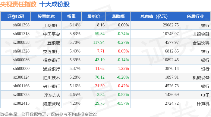 证券之星消息,11月27日,央视责任(399555)指数报收于5328.73点,跌0.07%,成交371.82亿元,换手率0.42%。当日该指数成份股中,上涨的有19家,硅宝科技以4.36%的涨幅领涨,下跌的有28家,中集集团以4.71%的跌幅领跌。
