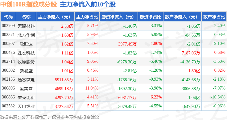 资金流向方面,中创100R(399611)指数成份股当日主力资金净流出合计62.27亿元,游资资金净流入合计15.91亿元,散户资金净流入合计46.36亿元。成份股资金流向详情见下表:
