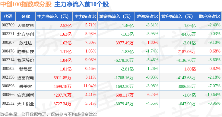 资金流向方面,中创100(399612)指数成份股当日主力资金净流出合计62.27亿元,游资资金净流入合计15.91亿元,散户资金净流入合计46.36亿元。成份股资金流向详情见下表: