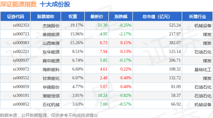 证券之星消息,11月27日,深证能源(399613)指数报收于3139.92点,跌0.33%,成交17.42亿元,换手率1.11%。当日该指数成份股中,上涨的有8家,广聚能源以0.47%的涨幅领涨,下跌的有5家,美锦能源以2.17%的跌幅领跌。