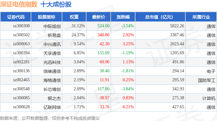 证券之星消息,11月27日,深证电信(399621)指数报收于10693.58点,跌0.18%,成交906.28亿元,换手率4.36%。当日该指数成份股中,上涨的有13家,太辰光以7.51%的涨幅领涨,下跌的有10家,长芯博创以3.84%的跌幅领跌。
