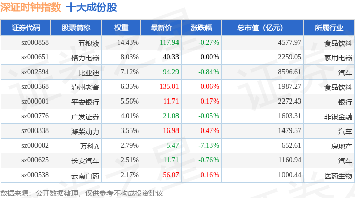 证券之星消息,11月27日,深证时钟(399644)指数报收于3483.48点,跌0.12%,成交454.44亿元,换手率1.51%。当日该指数成份股中,上涨的有44家,西安饮食以7.06%的涨幅领涨,下跌的有47家,万科A以7.13%的跌幅领跌。