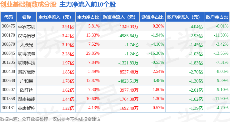 资金流向方面,创业基础(399640)指数成份股当日主力资金净流出合计79.53亿元,游资资金净流入合计24.55亿元,散户资金净流入合计54.98亿元。成份股资金流向详情见下表: