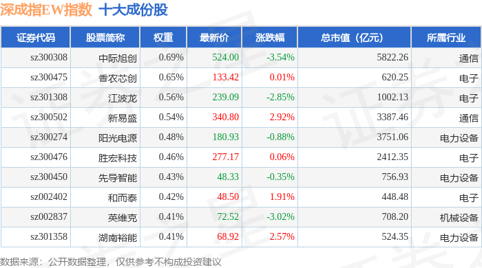 深成指EW(399659)指数十大成份股详情如下: