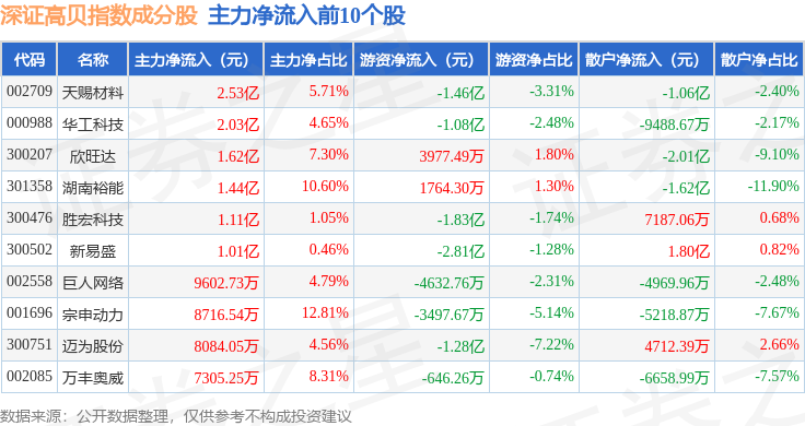 资金流向方面,深证高贝(399662)指数成份股当日主力资金净流出合计50.97亿元,游资资金净流入合计20.11亿元,散户资金净流入合计30.87亿元。成份股资金流向详情见下表: