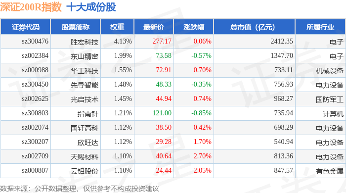 证券之星消息,11月27日,深证200R(399679)指数报收于5902.53点,涨0.08%,成交1405.47亿元,换手率1.42%。当日该指数成份股中,上涨的有81家,迈为股份以6.76%的涨幅领涨,下跌的有108家,石基信息以9.98%的跌幅领跌。