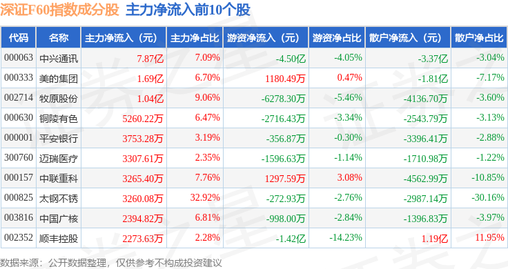 资金流向方面,深证F60(399701)指数成份股当日主力资金净流出合计12.34亿元,游资资金净流入合计7251.56万元,散户资金净流入合计11.62亿元。成份股资金流向详情见下表:
