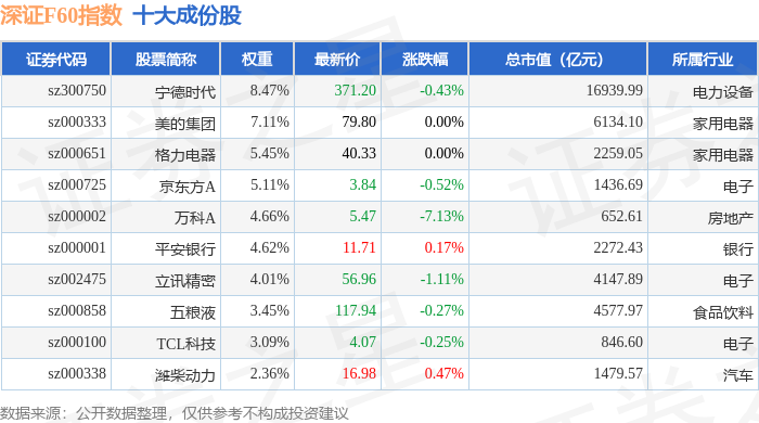 证券之星消息,11月27日,深证F60(399701)指数报收于7881.04点,跌0.43%,成交682.7亿元,换手率0.74%。当日该指数成份股中,上涨的有24家,中兴通讯以3.25%的涨幅领涨,下跌的有32家,万科A以7.13%的跌幅领跌。