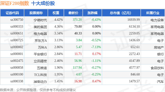 证券之星消息,11月27日,深证F200(399703)指数报收于7367.41点,跌0.31%,成交1982.21亿元,换手率1.05%。当日该指数成份股中,上涨的有86家,太阳纸业以3.87%的涨幅领涨,下跌的有100家,万科A以7.13%的跌幅领跌。