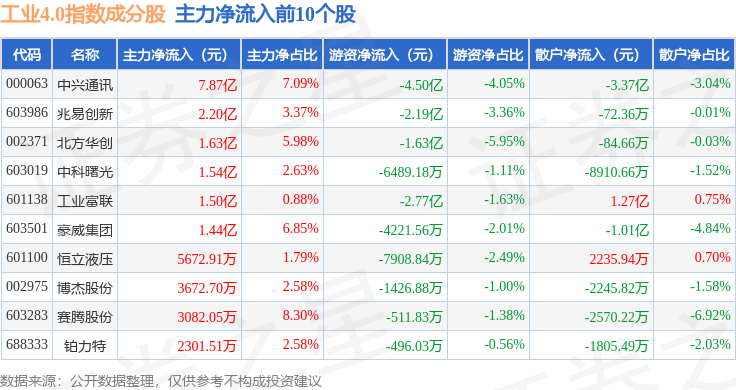 资金流向方面,工业4.0(399803)指数成份股当日主力资金净流入合计6.76亿元,游资资金净流出合计10.23亿元,散户资金净流入合计3.42亿元。成份股资金流向详情见下表:
