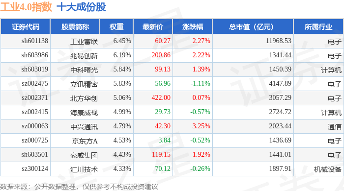 工业4.0(399803)指数十大成份股详情如下: