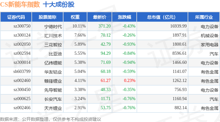 证券之星消息,11月27日,CS新能车(399976)指数报收于4233.33点,涨0.06%,成交747.94亿元,换手率2.64%。当日该指数成份股中,上涨的有27家,瑞泰新材以3.54%的涨幅领涨,下跌的有21家,雅化集团以1.49%的跌幅领跌。