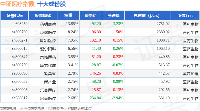 中证医疗(399989)指数十大成份股详情如下: