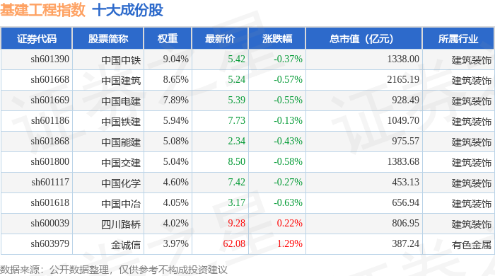 证券之星消息,11月27日,基建工程(399995)指数报收于3804.62点,跌0.47%,成交128.55亿元,换手率0.71%。当日该指数成份股中,上涨的有12家,亚翔集成以2.87%的涨幅领涨,下跌的有35家,中钢国际以4.36%的跌幅领跌。