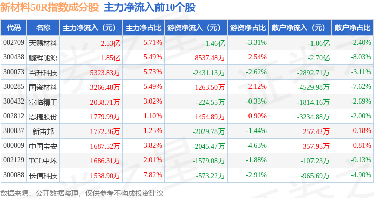 资金流向方面,新材料50R(470042)指数成份股当日主力资金净流出合计19.31亿元,游资资金净流入合计2.19亿元,散户资金净流入合计17.12亿元。成份股资金流向详情见下表: