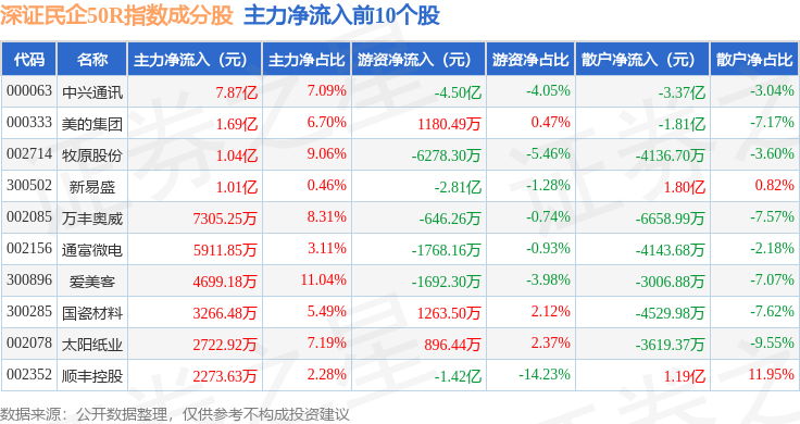 资金流向方面,深证民企50R(470057)指数成份股当日主力资金净流出合计39.87亿元,游资资金净流入合计9.35亿元,散户资金净流入合计30.51亿元。成份股资金流向详情见下表: