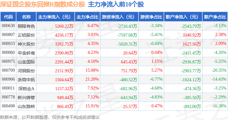 资金流向方面,深证国企股东回报R(470064)指数成份股当日主力资金净流出合计4.2亿元,游资资金净流入合计6221.9万元,散户资金净流入合计3.58亿元。成份股资金流向详情见下表: