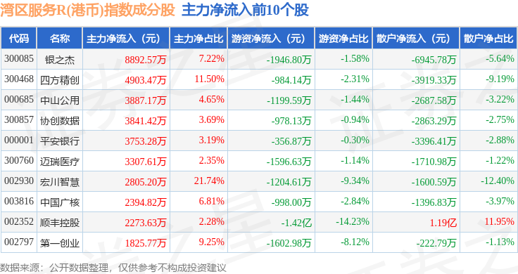 资金流向方面,湾区服务R(港币)(480012)指数成份股当日主力资金净流出合计3.93亿元,游资资金净流出合计5642.32万元,散户资金净流入合计4.49亿元。成份股资金流向详情见下表: