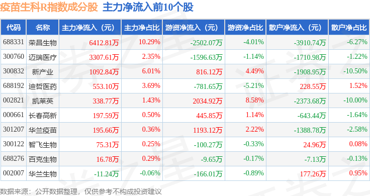 资金流向方面,疫苗生科R(480015)指数成份股当日主力资金净流出合计12.53亿元,游资资金净流入合计6.6亿元,散户资金净流入合计5.93亿元。成份股资金流向详情见下表: