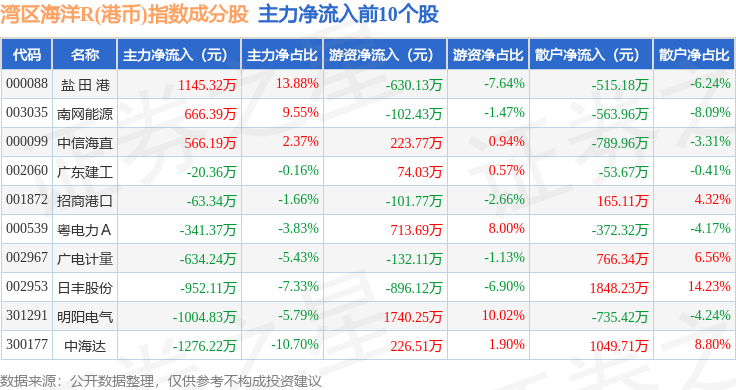 资金流向方面,湾区海洋R(港币)(480020)指数成份股当日主力资金净流出合计2.22亿元,游资资金净流入合计8803.63万元,散户资金净流入合计1.34亿元。成份股资金流向详情见下表: