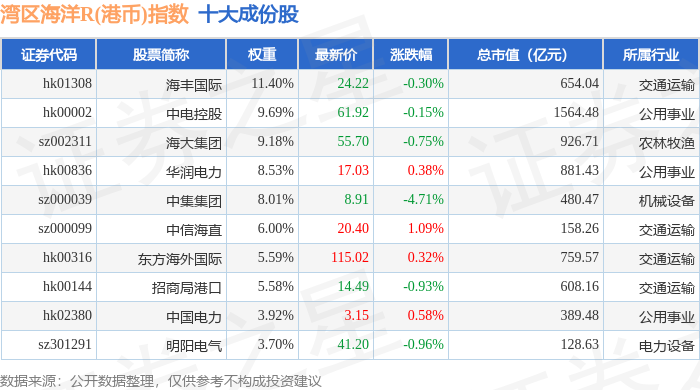 湾区海洋R(港币)(480020)指数十大成份股详情如下:
