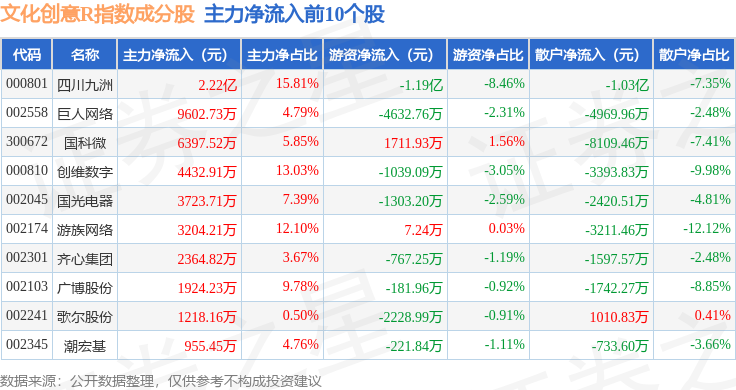 资金流向方面,文化创意R(480046)指数成份股当日主力资金净流出合计28.77亿元,游资资金净流出合计2092.64万元,散户资金净流入合计28.98亿元。成份股资金流向详情见下表: