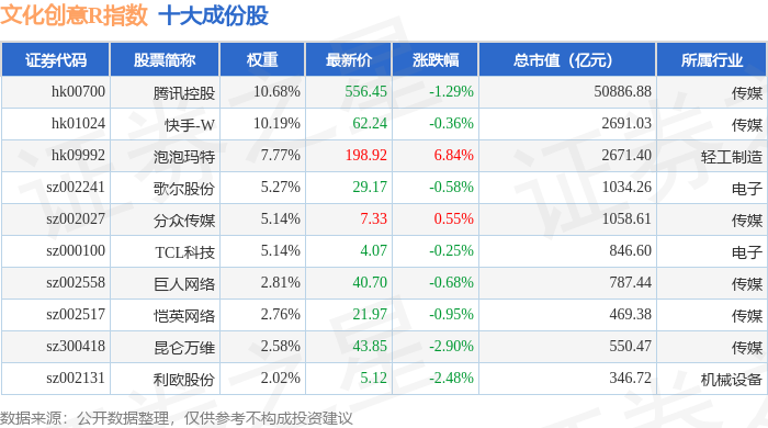 文化创意R(480046)指数十大成份股详情如下: