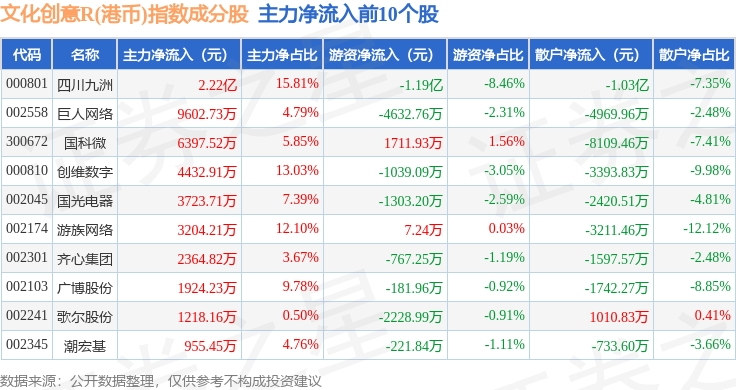 资金流向方面,文化创意R(港币)(480047)指数成份股当日主力资金净流出合计28.77亿元,游资资金净流出合计2092.64万元,散户资金净流入合计28.98亿元。成份股资金流向详情见下表: